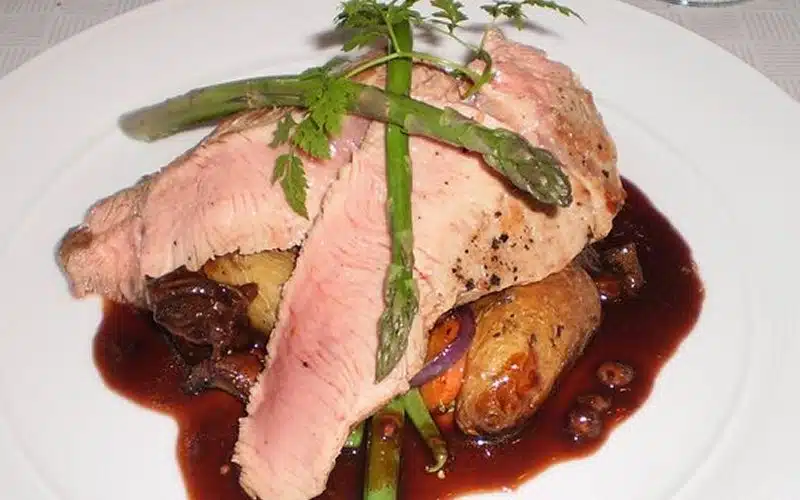 Jednostavno pirjana teletina. Komad osoljene teletine stavimo na vruću mast s nekoliko prženih režnjeva luka, pirjamo poklopljeno, u početku u vlastitom soku, kasnije uz češće dolijevanje govedske juhe, dok meso ne postane lijepo pečeno i ne dobije smeđu boju.